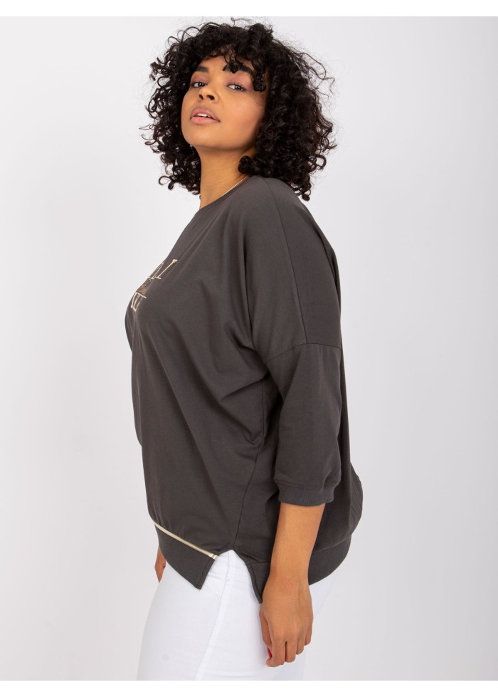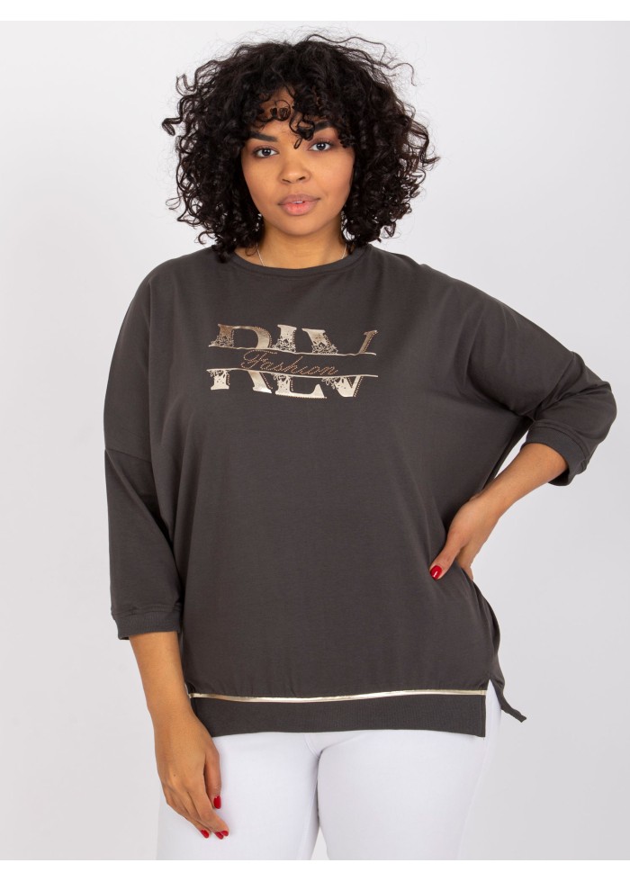 Dámske bavlnené tričko, okrúhly výstrih, 3/4 rukávy s lémom, ozdobná potlač, malé rozparky na bokoch, zlatý prúžok na spodnom léme, pohodlný voľný strih, univerzálna veľkosť, materiál: 90% bavlna, 10% elastan, spôsob prania: pranie v práčke na 30°c, modelka má na sebe univerzálnu veľkosť, rozmery modelky: výška 175 cm, prsia 103 cm, pás 86 cm, boky 118 cm., rozmery trička merané naplocho: šírka v podpazuší - 79 cm, celková dĺžka - 70 cm, dĺžka rukáva - 47 cm..