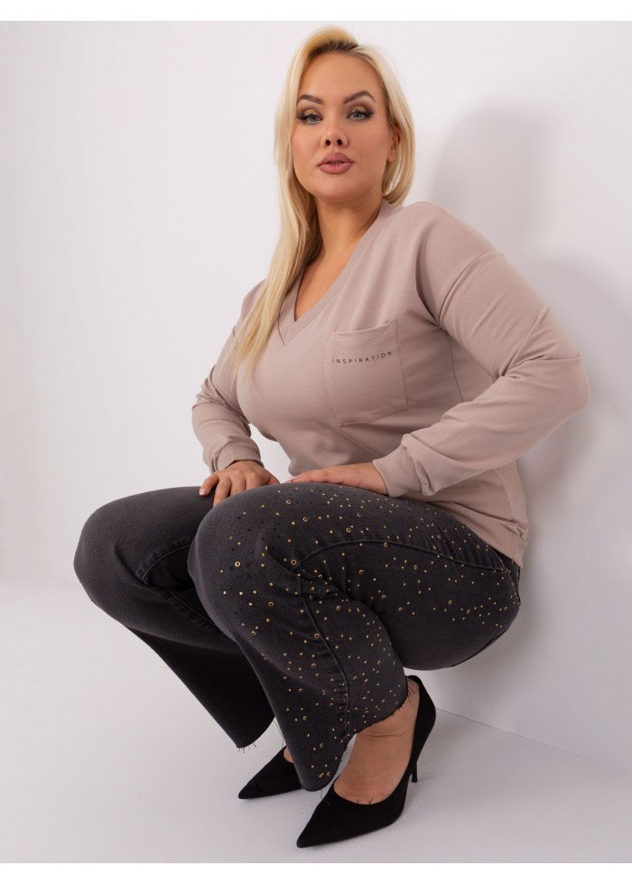 Dámske tričko s dlhým rukávom, výstrih do v, 1 náprsné vrecko, ozdobný nápis, lémy na koncoch rukávov a v spodnej časti, univerzálna veľkosť, miery modelky: výška 172 cm, prsia 103 cm, pás 73 cm, boky 103 cm., rozmer produktu meraného na plocho:, šírka pod plecami: 54 cm, dĺžka rukáva: 59 cm, celková dĺžka: 61 cm.