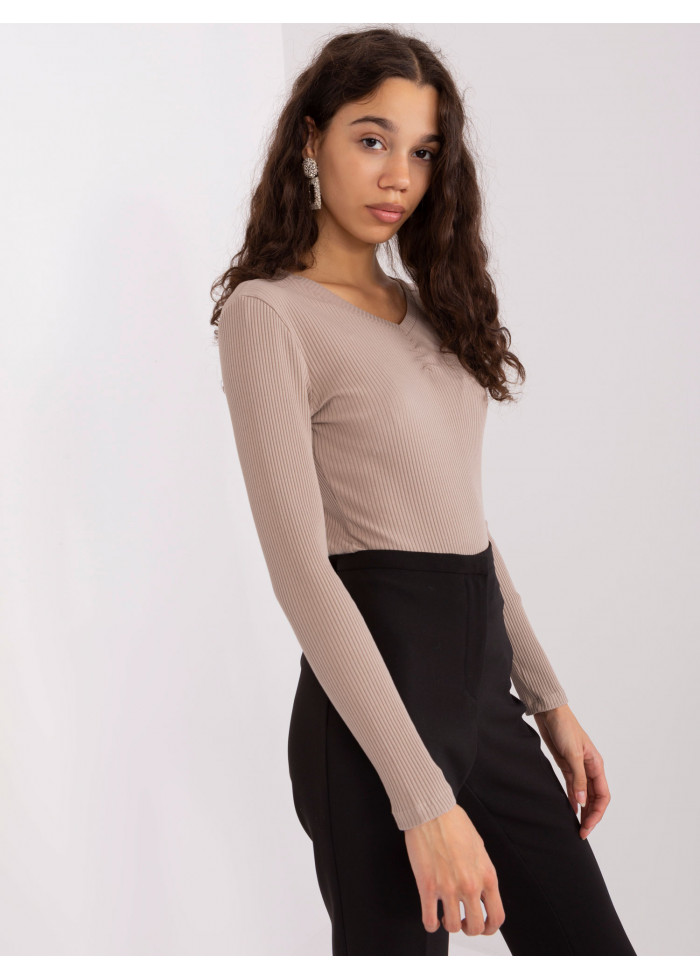 Dámske tričko s dlhým rukávom, výstrih do v, jednoduchý obtiahnutý strih, rebrovaný úplet, modelka má na sebe veľkosť s/m, miery modelky: výška: 177 cm, prsia: 84 cm, pás: 62 cm, boky: 89 cm, rozmer produktu meraného na plocho, vo veľkosti s/m:, šírka pod plecami: 37 cm, dĺžka rukáva: 56 cm, celková dĺžka: 57 cm.