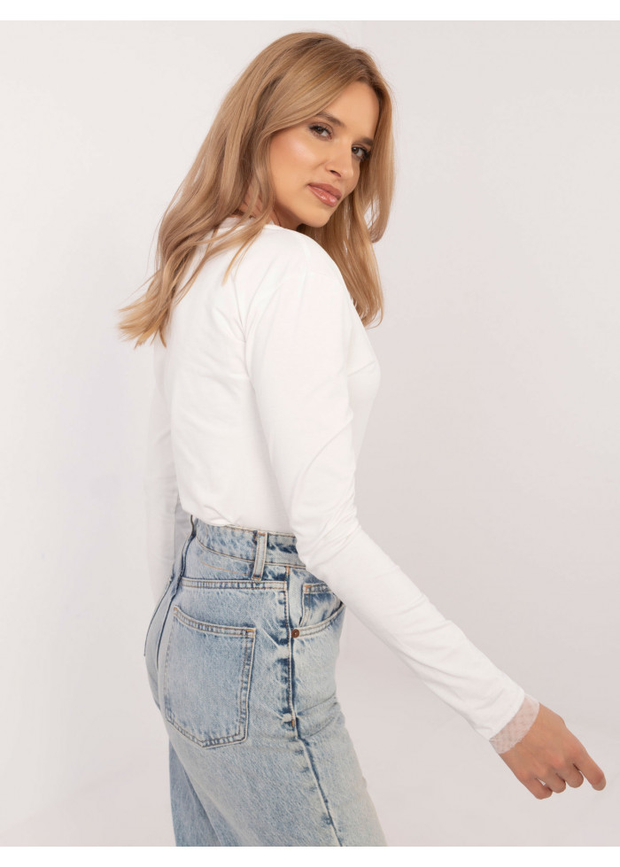 Dámske tričko s dlhým rukávom, jednoduchý rovný strih, okrúhly zdobený výstrih, nádpis v prednej časti, dlhé rukávy ukončené zdobeným priesvitným lémom, modelka má na sebe veľkosť s, miery modelky: výška 175 cm, prsia 90 cm, pás 66 cm, boky 94 cm, rozmery trička vo veľkosti s merané na plocho:, šírka v podpazuší - 46 cm, dĺžka blúzky - 58 cm, dĺžka rukáva - 59 cm (od švu)..