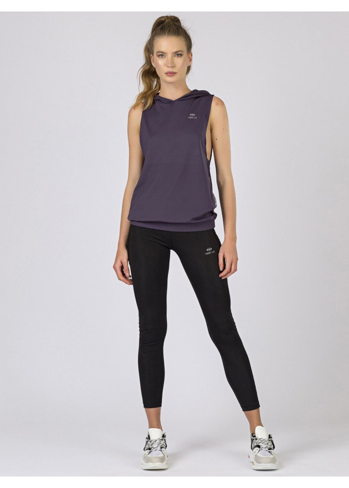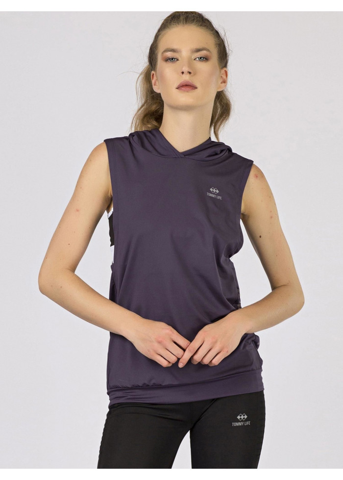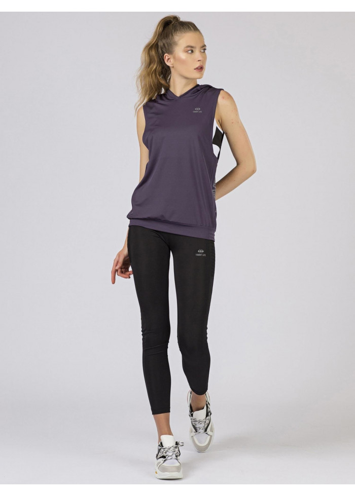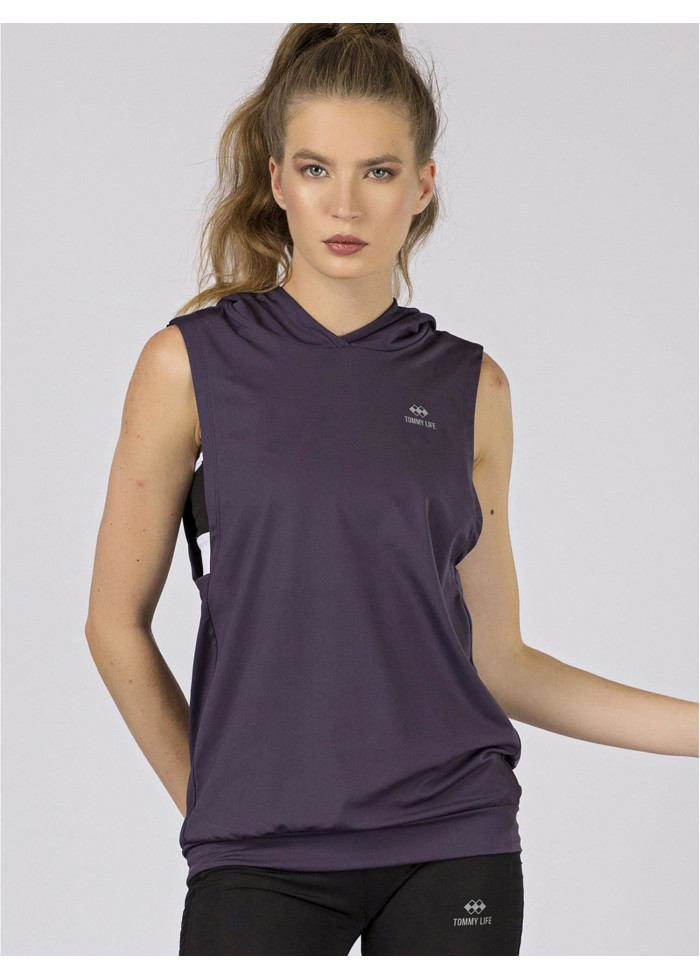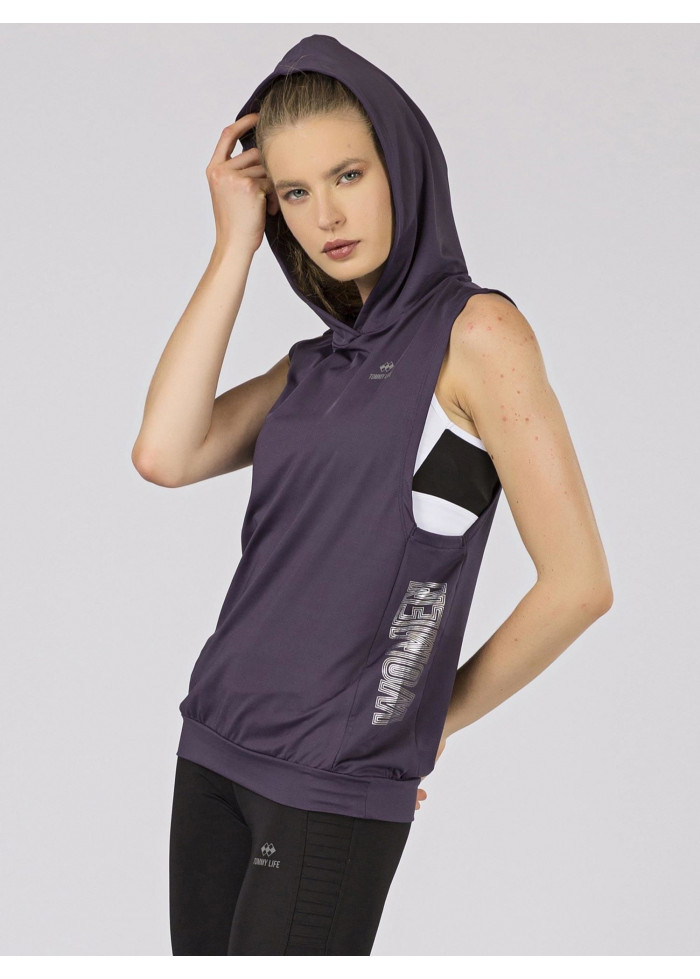 Tommy life, tričko s kapucňou, výrazný výstrih pod pazuchou, potlač, spôsob prania: pranie v práčke na 30°c, materiál: 95% polyester, 5% elastan, modelka má na sebe veľkosť s.