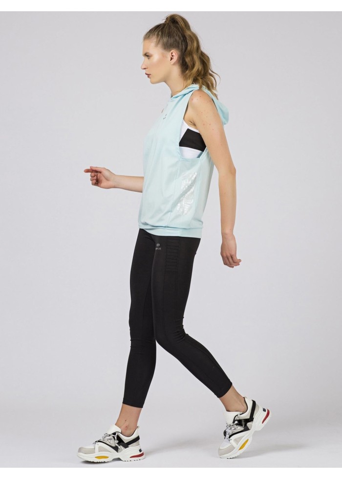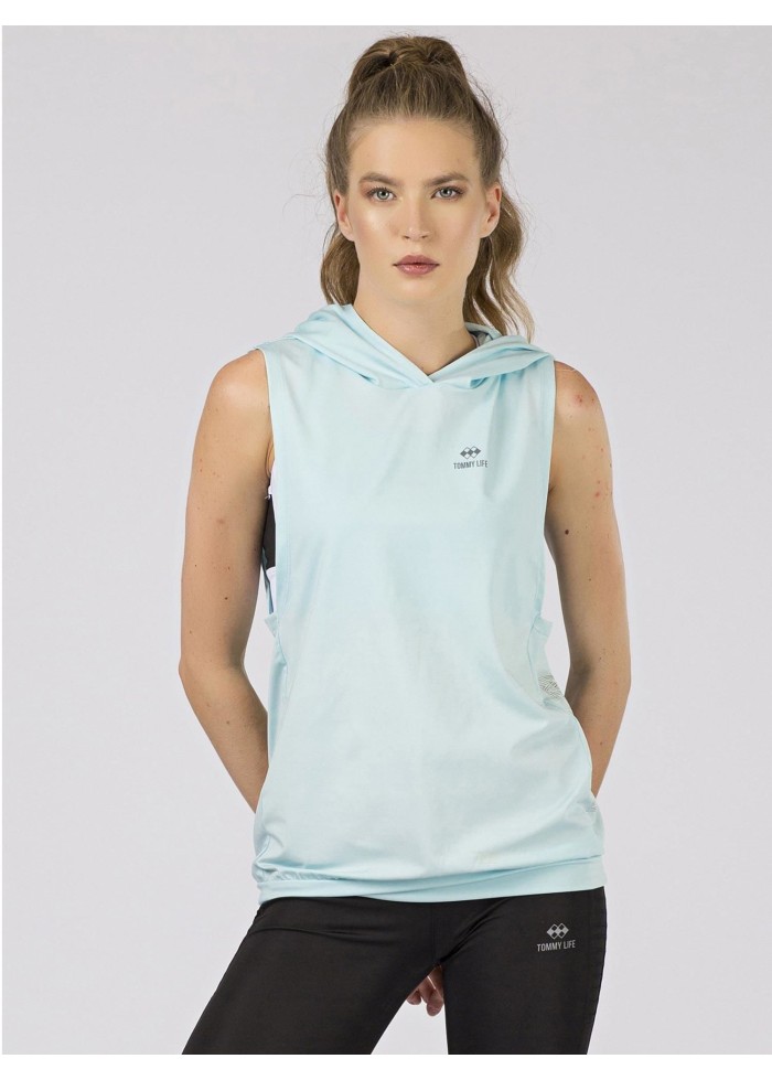 Tommy life, tričko s kapucňou, výrazný výstrih pod pazuchou, potlač, spôsob prania: pranie v práčke na 30°c, materiál: 95% polyester, 5% elastan, modelka má na sebe veľkosť s.