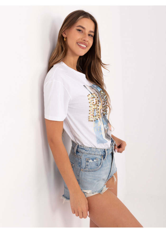 Dámske tričko s potlačou, ozdobné aplikácie, jednoduchý strih, spôsob prania: pranie v práčke na 30°c, materiál: 100% bavlna, modelka má na sebe veľkosť s. rozmery modelky: výška 165 cm, prsia 83 cm, pás 64 cm, boky 90 cm., rozmer produktu meraného na plocho, vo veľkosti s:, šírka pod plecami: 50 cm, celková dĺžka: 64 cm.