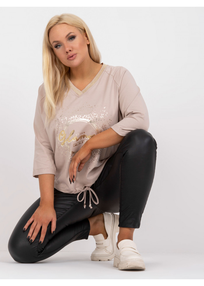 Dámske tričko s potlačou, výstrih do v, 3/4 rukávy, šnúrka na stiahnutie v spodnej časti, materiál: 90% bavlna, 10% elastan, spôsob prania: pranie v práčke na 30°c, univerzálna veľkosť, miery modelky: výška 172 cm, prsia 103 cm, pás 73 cm, boky 103 cm., rozmer produktu meraného na plocho:, šírka pod plecami: 65 cm, dĺžka rukáva: 42 cm, celková dĺžka: 60 cm.