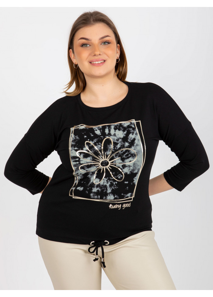 Dámske tričko s potlačou, okrúhly výstrih, 3/4 rukávy, šnúrka v spodnej časti, univerzálna veľkosť, miery modelky: výška: 176 cm, prsia: 111 cm, pás: 82 cm, boky: 114 cm, rozmer produktu meraného na plocho:, šírka pod plecami: 60 cm, dĺžka rukáva: 44 cm, celková dĺžka: 62 cm.