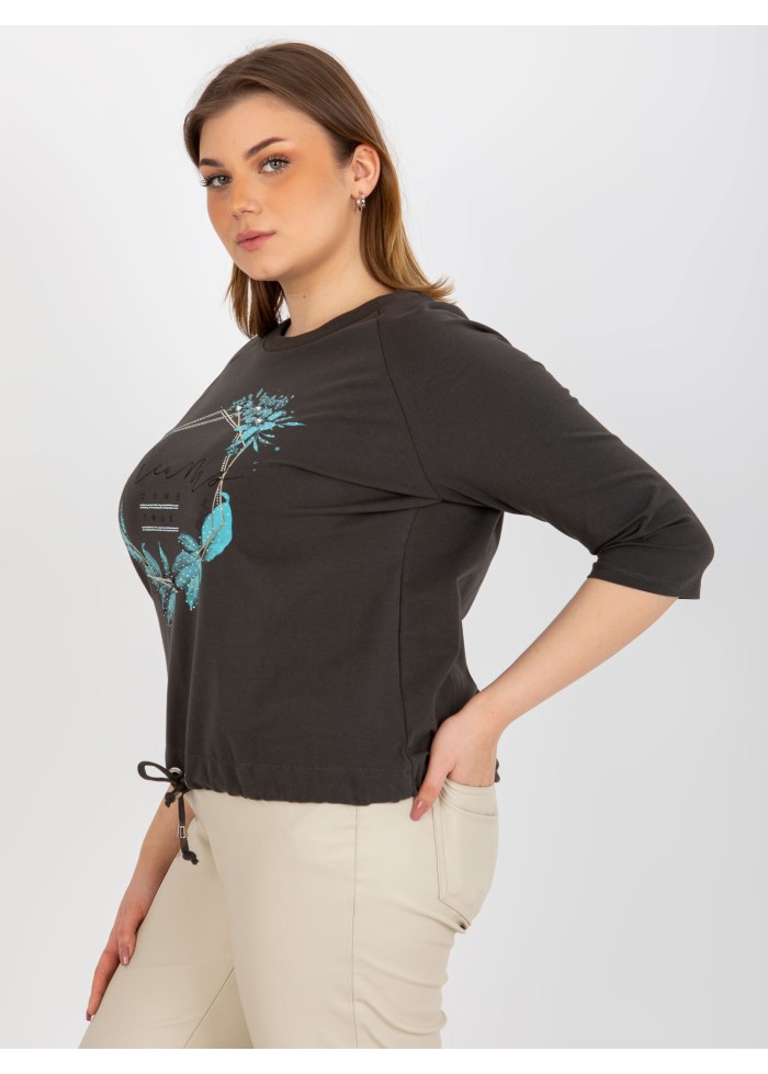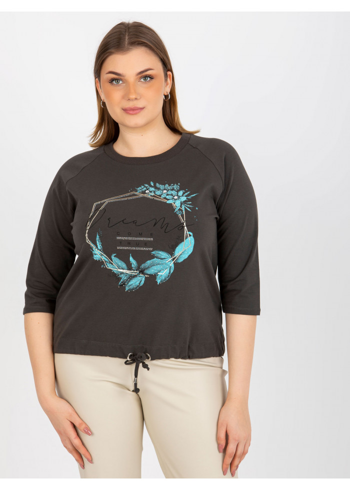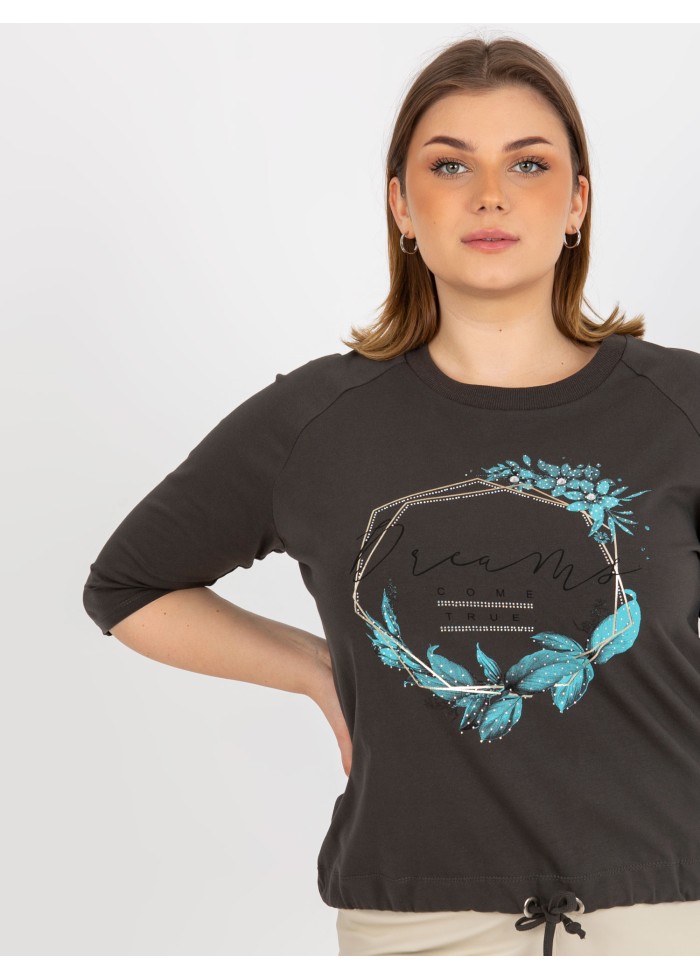 Dámske tričko s potlačou, 3/4 rukávy, okrúhly výstrih, šnúrka v spodnej časti, univerzálna veľkosť, miery modelky: výška 172 cm, prsia 103 cm, pás 73 cm, boky 103 cm., rozmer produktu meraného na plocho:, šírka pod plecami: 60 cm, dĺžka rukáva: 42 cm, celková dĺžka: 64 cm.