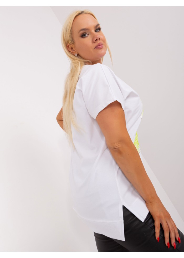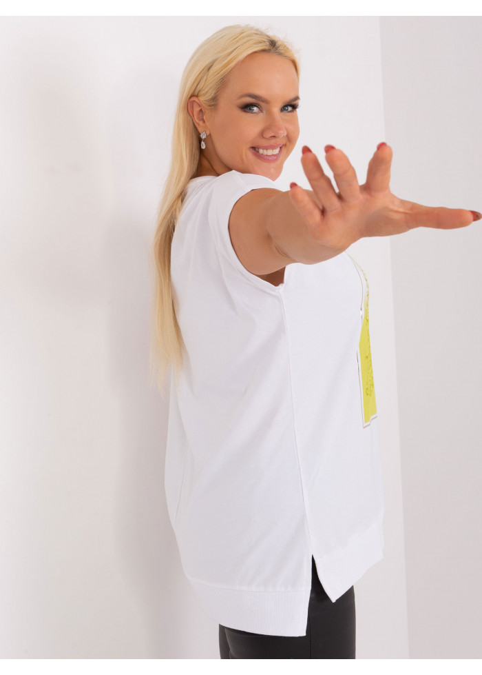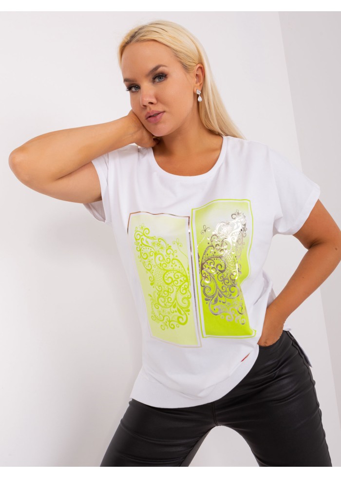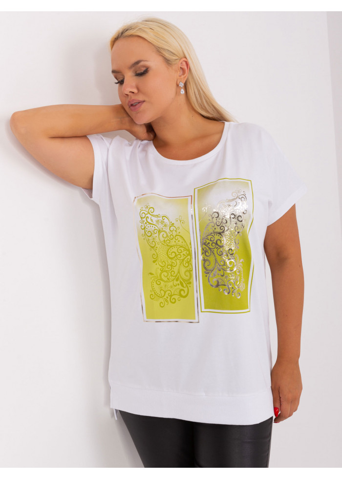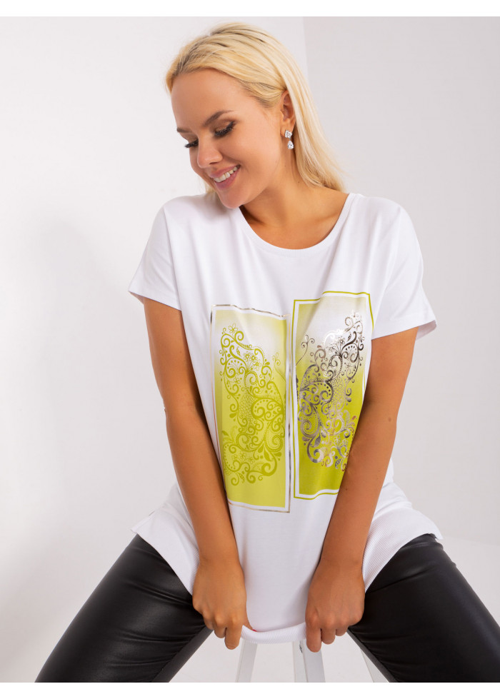 Dámske tričko s potlačou, okrúhly výstrih, krátky rukáv, asymetrický strih, malé rozparky po bokoch, lém na spodnej časti, univerzálna veľkosť, miery modelky: výška 172 cm, prsia 103 cm, pás 73 cm, boky 103 cm., rozmer produktu meraného na plocho:, šírka pod plecami: 59 cm, celková dĺžka: 73 cm.
