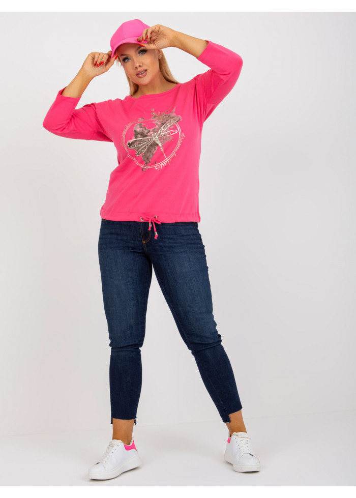 Dámske tričko s potlačou, okrúhly výstrih, 3/4 rukávy, šnúrka na stiahnutie v spodnej časti, univerzálna veľkosť, miery modelky: výška 172 cm, prsia 103 cm, pás 73 cm, boky 103 cm., rozmer produktu meraného na plocho:, šírka pod plecami: 61 cm, dĺžka rukáva: 44 cm, celková dĺžka: 65 cm.