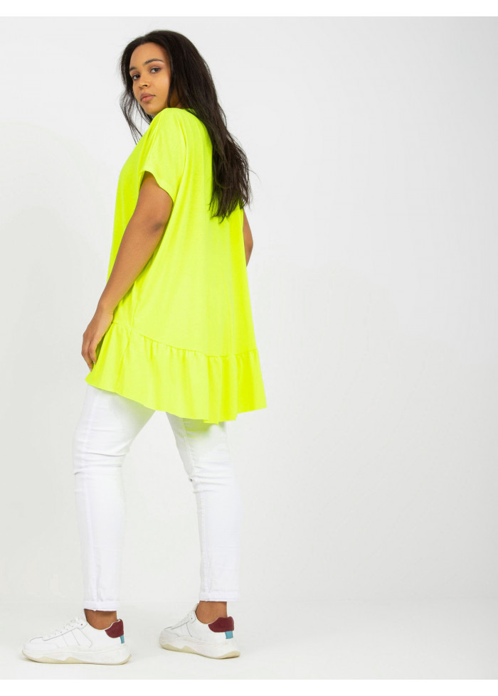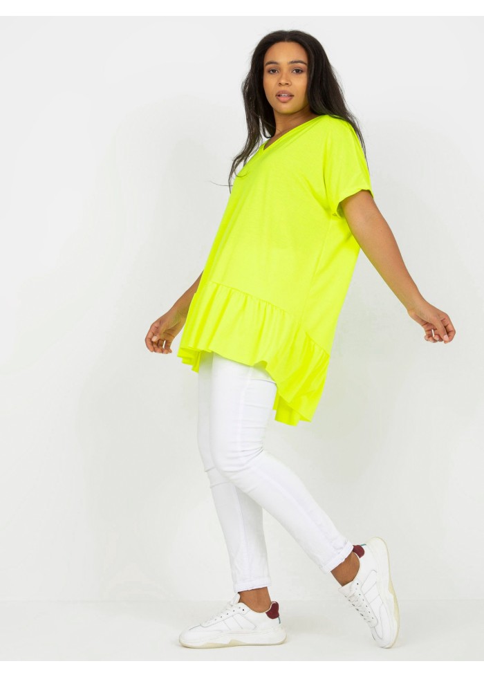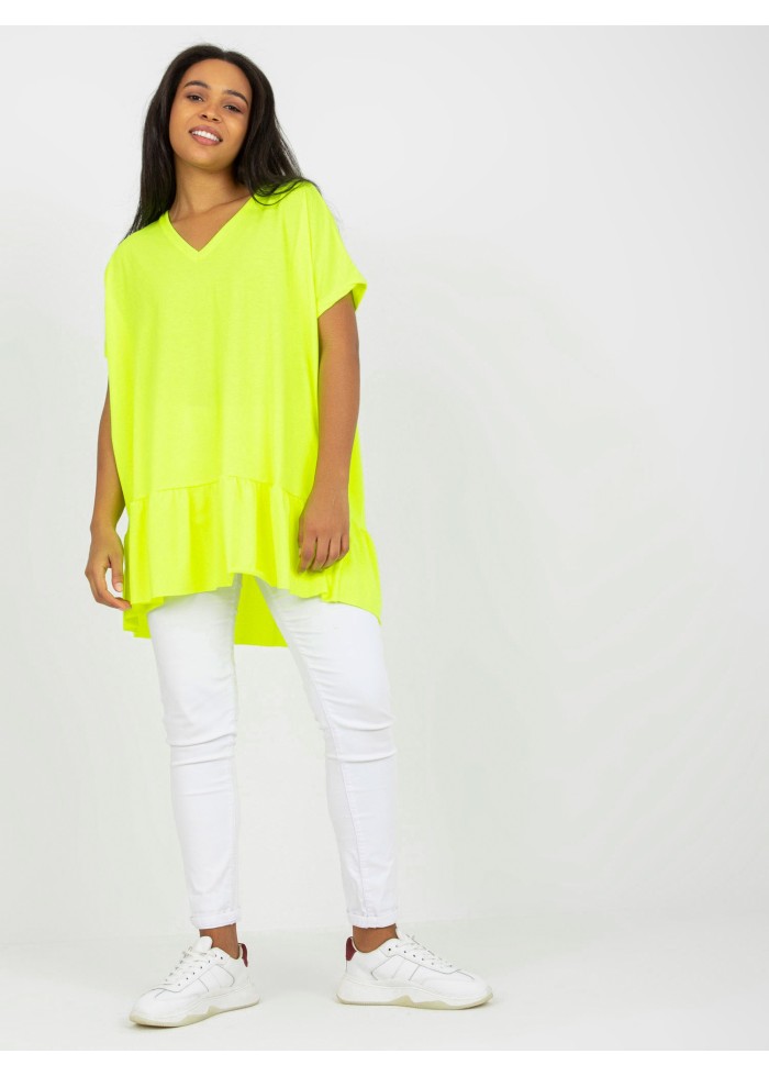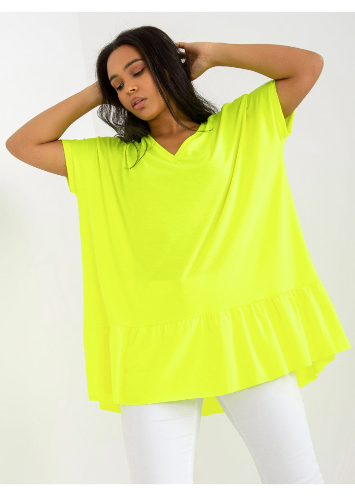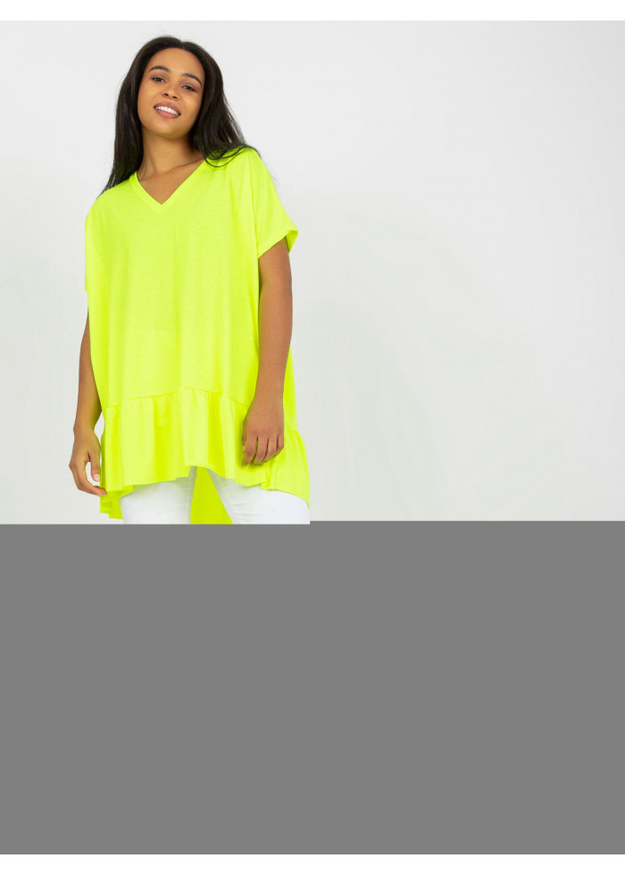 Asymetrická dámska tunika, výstrih do v, krátky rukáv, spodná časť s volánom, voľnejší strih, univerzálna veľkosť, miery modelky: výška: 175 cm, prsia: 98 cm, pás: 76 cm, boky: 108 cm, rozmer produktu meraného na plocho:, šírka pod plecami: 67 cm, celková dĺžka: vpredu: 73 cm, vzadu: 80 cm.