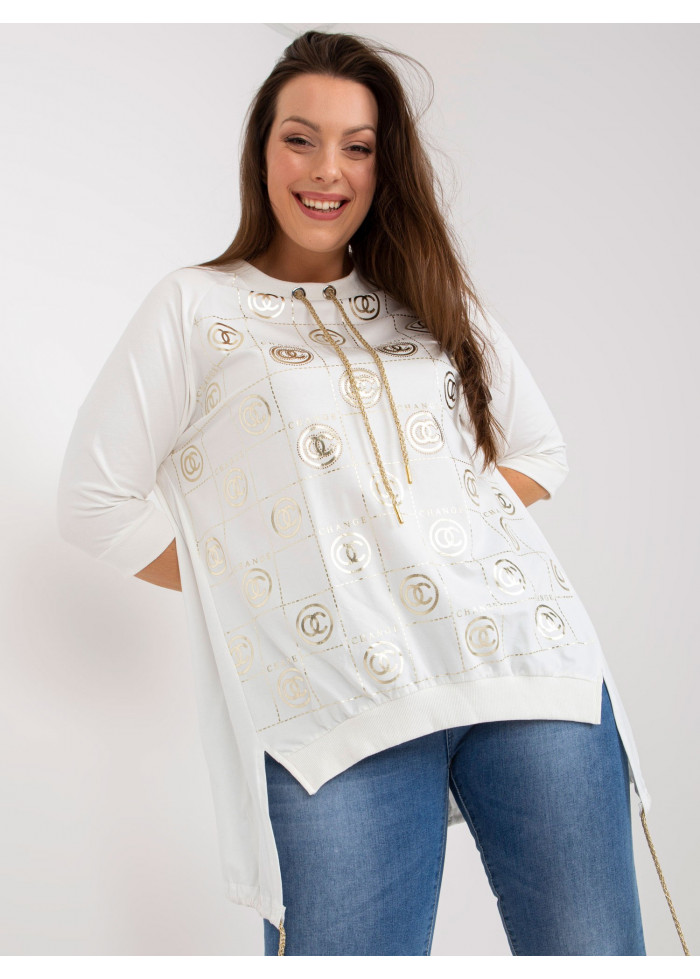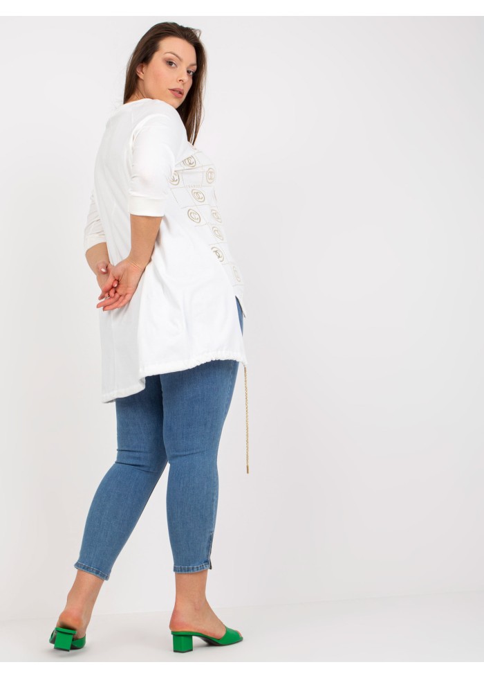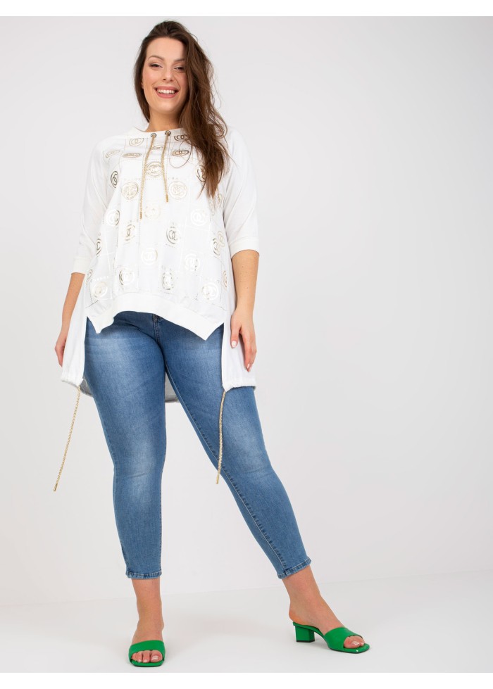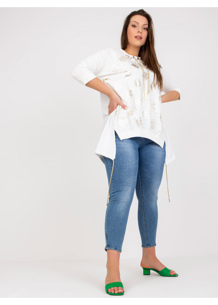 Asymetrická dámska tunika, ozdobná potlač, 3/4 rukávy, šnúrka v spodnej časti, lémy na koncoch rukávov a v spodnej časti, ozdobná šnúrka v dekolte, spôsob prania: pranie v práčke na 30°c, materiál: 90% bavlna, 10% elastan, univerzálna veľkosť, miery modelky: výška: 170 cm, prsia: 108 cm, pás: 86 cm, boky: 120 cm, rozmer produktu meraného na plocho:, šírka pod plecami: 65 cm, dĺžka rukáva: 39 cm, celková dĺžka: vpredu: 70 cm, vzadu: 87 cm.