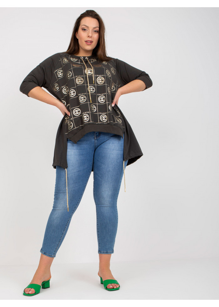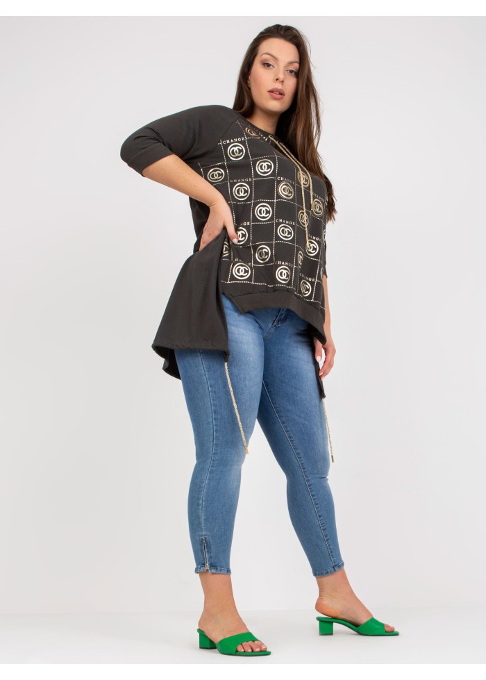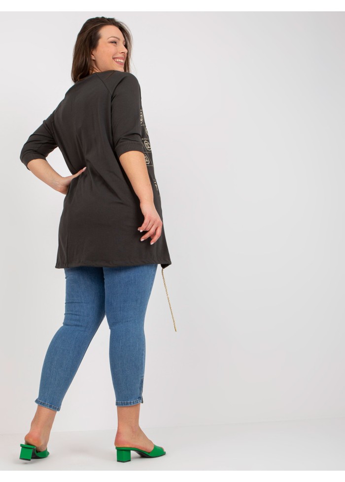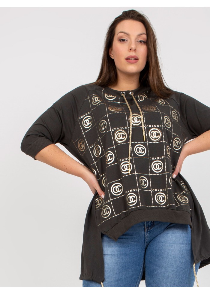 Asymetrická dámska tunika, ozdobná potlač, 3/4 rukávy, šnúrka v spodnej časti, lémy na koncoch rukávov a v spodnej časti, ozdobná šnúrka v dekolte, spôsob prania: pranie v práčke na 30°c, materiál: 90% bavlna, 10% elastan, univerzálna veľkosť, miery modelky: výška: 170 cm, prsia: 108 cm, pás: 86 cm, boky: 120 cm, rozmer produktu meraného na plocho:, šírka pod plecami: 65 cm, dĺžka rukáva: 39 cm, celková dĺžka: vpredu: 70 cm, vzadu: 87 cm.